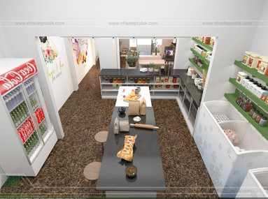 Khu vực chế biến được thiết kế với gam màu xanh và trắng làm chủ đạo. Hệ thống tủ, kệ gỗ đựng nguyên liệu, bàn làm bánh... Tất cả được sắp xếp, may đo theo từng góc cạnh phù hợp với không gian